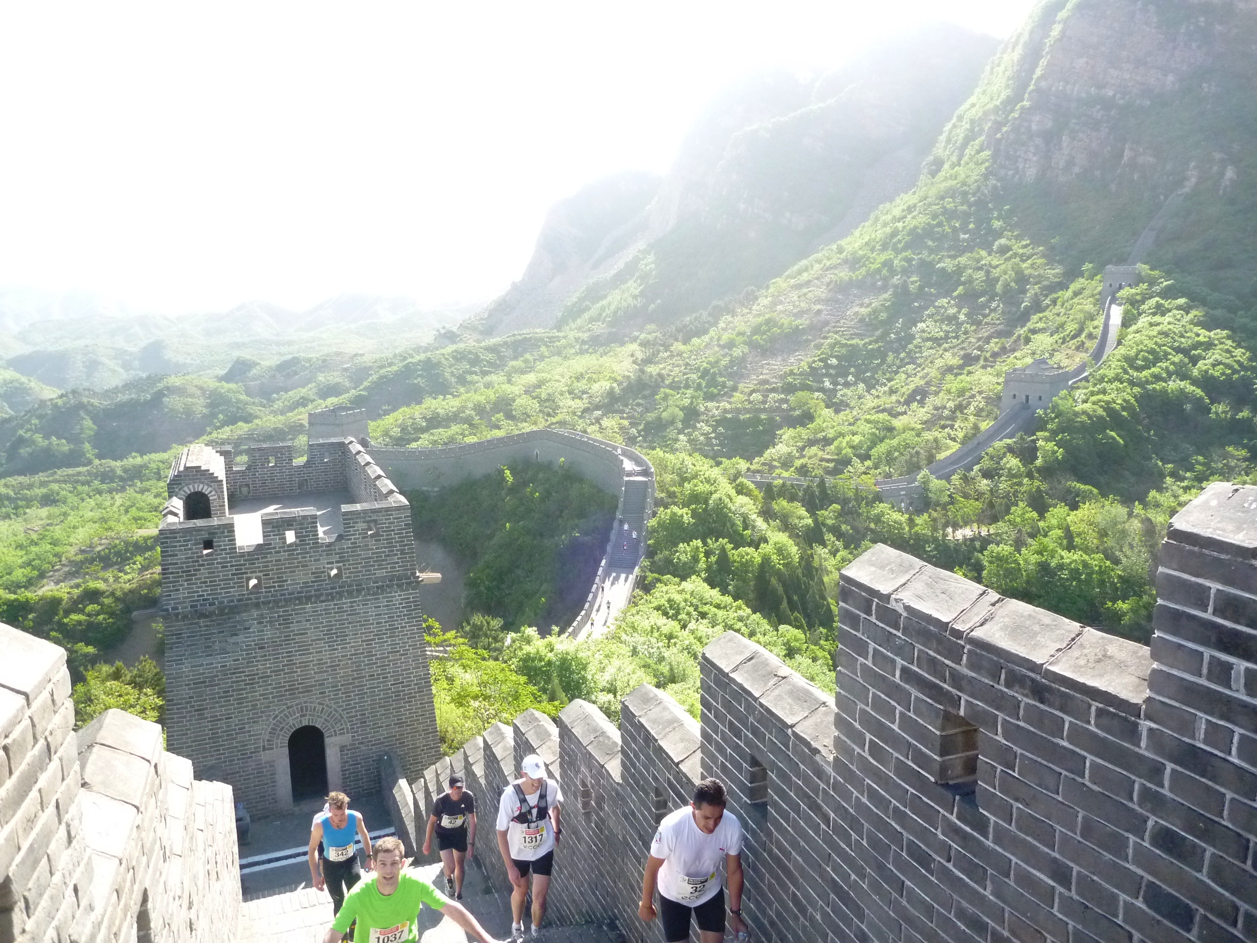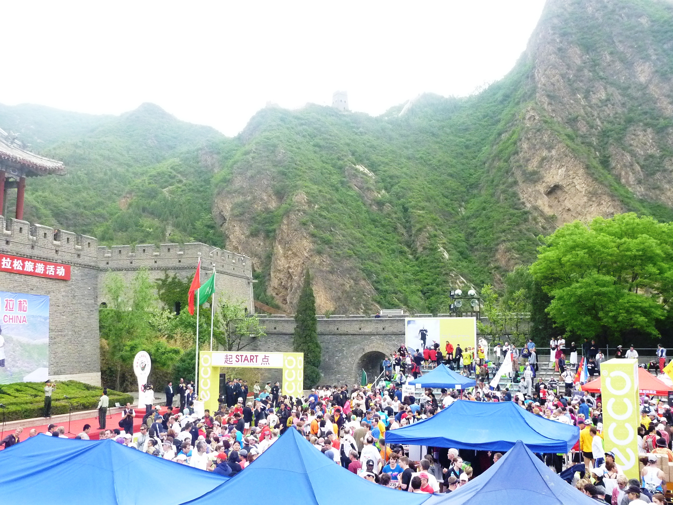 The race was based on a section of the wall in Huang Yaguan, 3 hours out of Beijing , where the air is clean and fresh, which is also rarely visited by tourists. It starts at the spectacular and well preserved Ying Yang fortress, nestled in the valley, with the wall punctuated by 12 large towers, looming ominously 500 m above.
