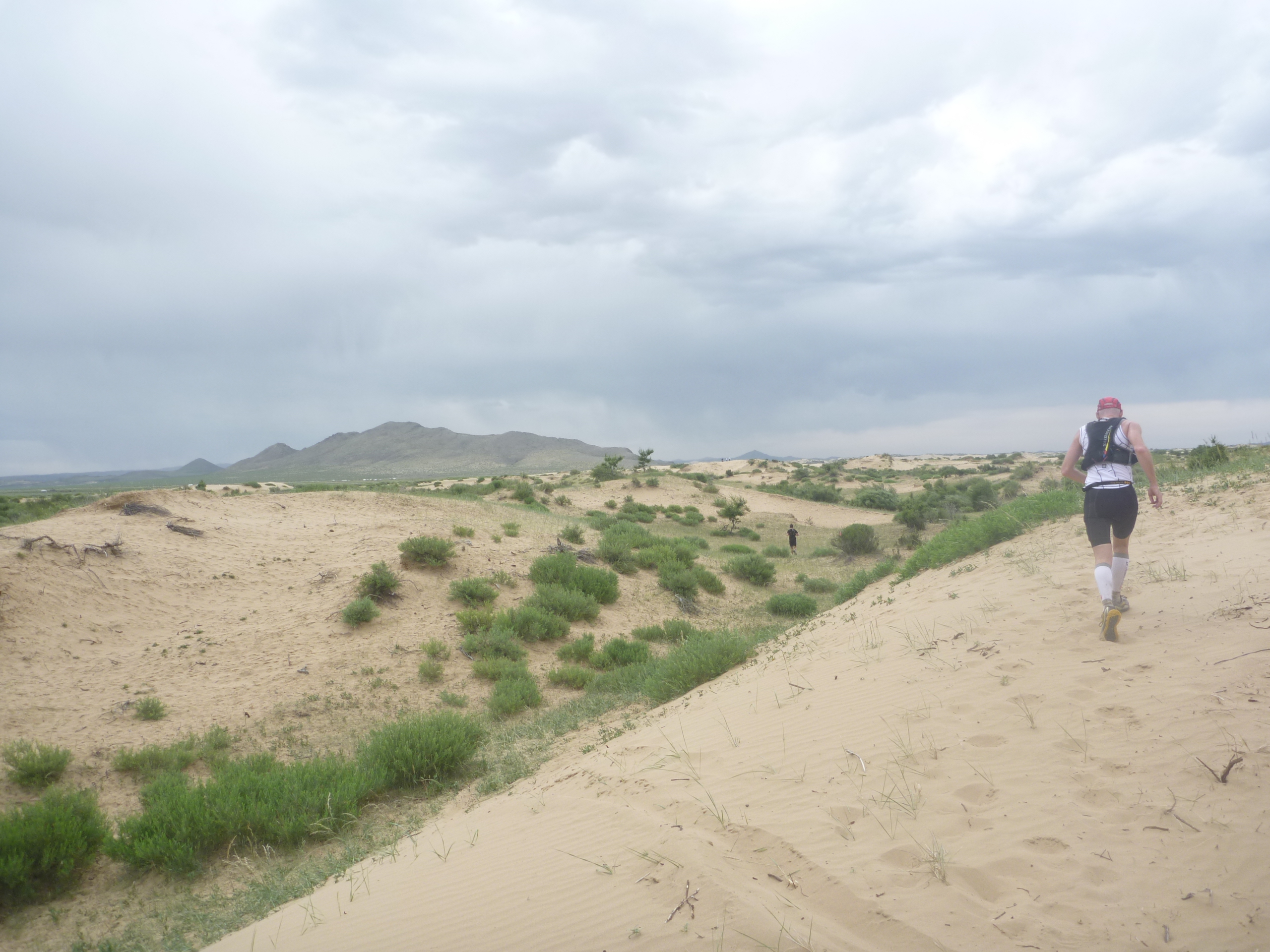 After a water top up we then headed off for the challenging 10km dunes section of the race. It was much more physically demanding running in the sand especially compared to the solid springiness of the prairie. Shoes quickly began to fill with sand. Then the mental strategic debate started – stop empty shoes, losing time and potentially sight of the two leaders or put up with the discomfort, the risk of blisters, Achilles injury or worse… I gambled for the next 8 km and finally managed to last until the boundary of the sand dunes and executed a rushed sand extraction before charging back into the grass lands, the leaders still in sight. The cost was a couple of manageable blisters.