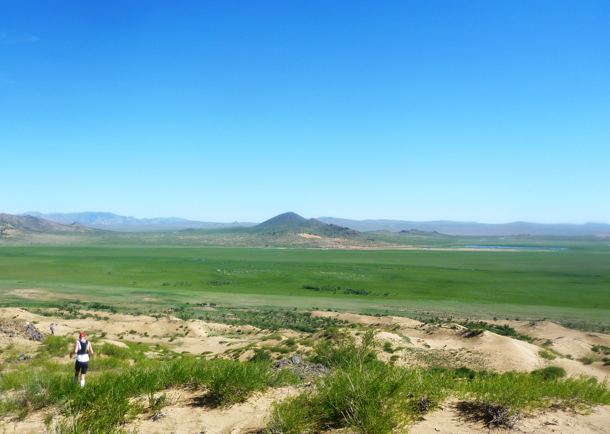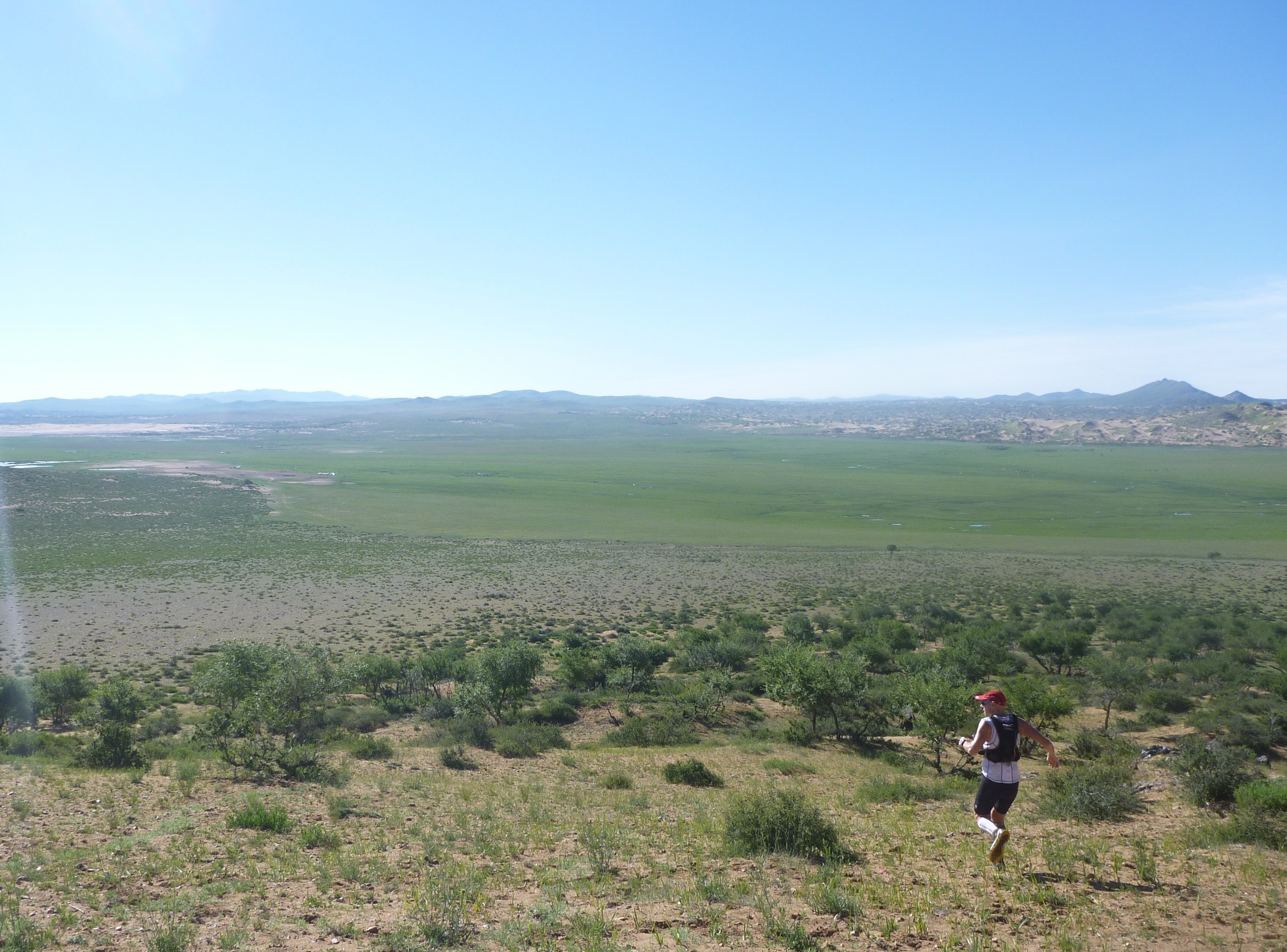 We ran around the huge rocky hill and shuffled past some local scenery. This consisted of some traditionally dressed Mongolians camping, flocks of sheep grazing and us running past a substantial looking horse ranch. We then had a challenging (nice) ascent up some very technical terrain towards the peak. A quick photo of the dramatic and varied scenery before charging back down again to tackle a long dull plod along a never ending, dusty road that frustratingly meandered and meandered (a touch of Roman road building style would have been greatly appreciated) gently upwards towards the camp. Day one’s 43km was nailed in 4 hours and 30mins.
