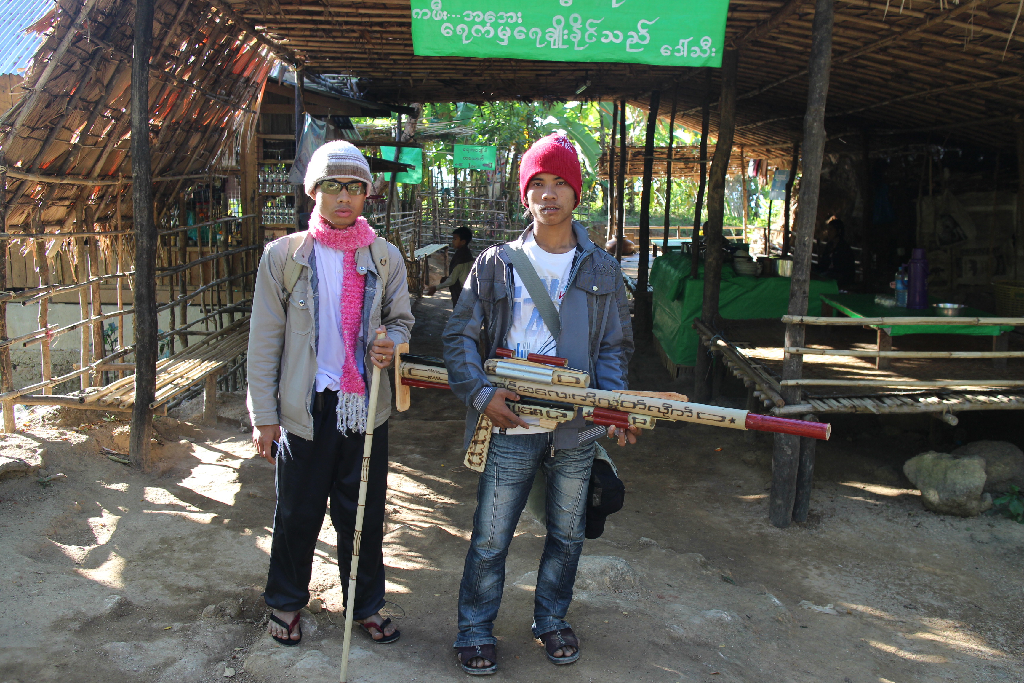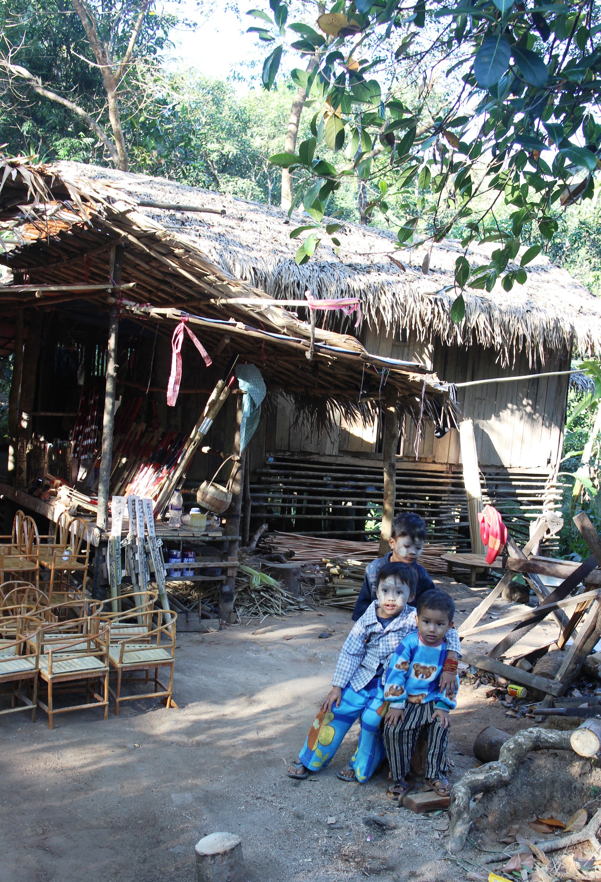As we arrived at Kinpin the day itself was waking up. It was a cool fresh morning and smoke from the local fires drifted through the air.  Locals were still wrapped up warm from the night before. They were busy setting up their stalls and preparing for the day’s trading. The main hiking trail snakes through the village of Kinpin and is lined with 100s of bamboo thatched huts, each with a colourful awning to protect the strategically positioned stall from the hot sun.