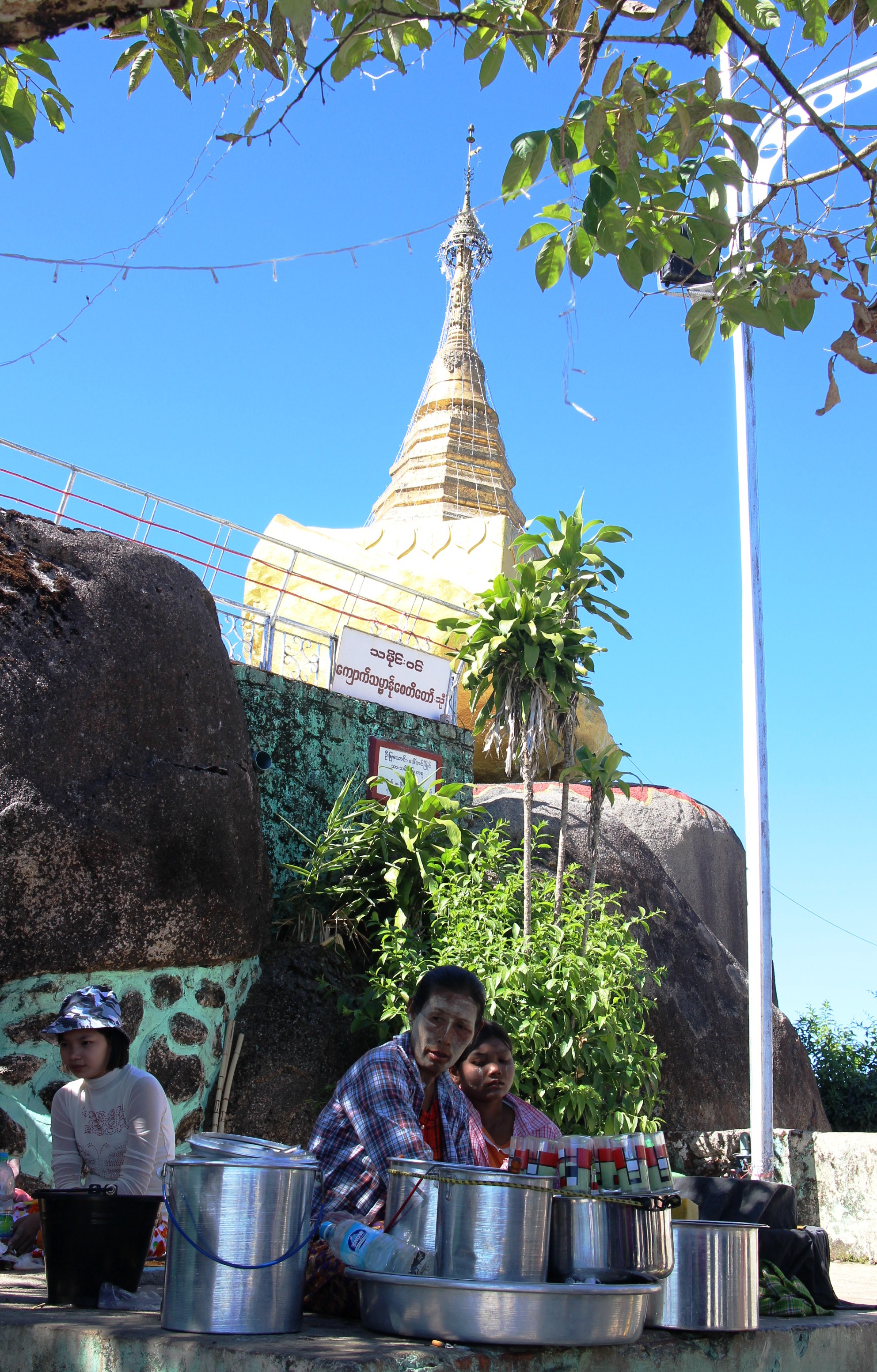 We sat and watched then strolled around the Golden Rock, appreciating it and the energy around it from different angles. We chatted to locals and asked about their pilgrimage or visit and the importance of The Rock. We then retreated for a nice cup of tea and put it all together. The conclusion – The Golden Rock itself is big and pretty and situated with a beautiful backdrop but the real tourist attraction is what it means to the Burmese and the incredible human energy that surrounds it. The people are as interesting to watch as the stupa.
